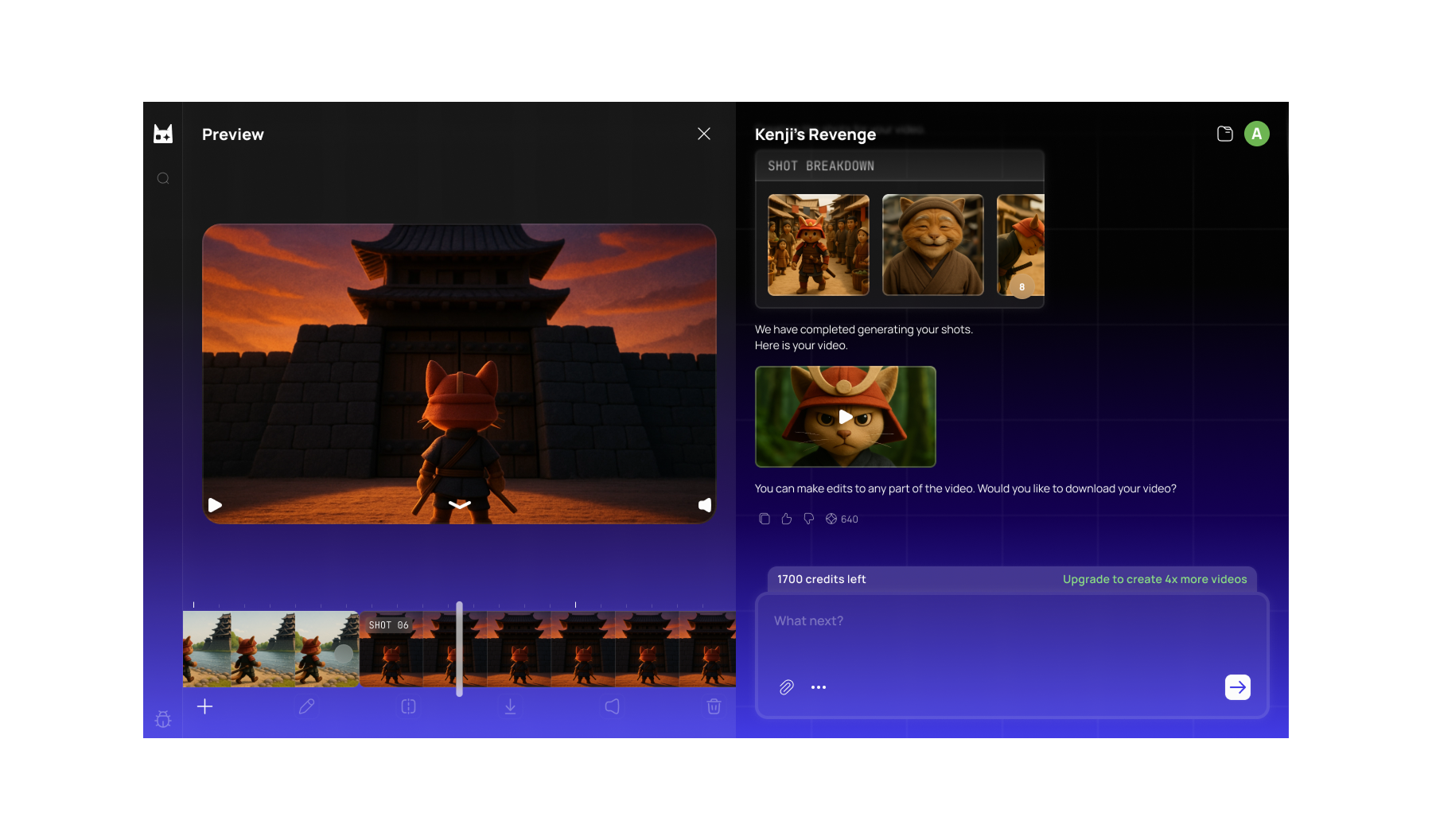 Adaptive UI on the left — script, characters, shots, preview, timeline, all on demand.