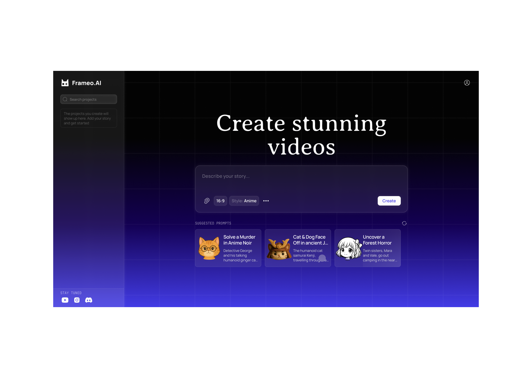 Home page, describe your story, pick a style, hit create.