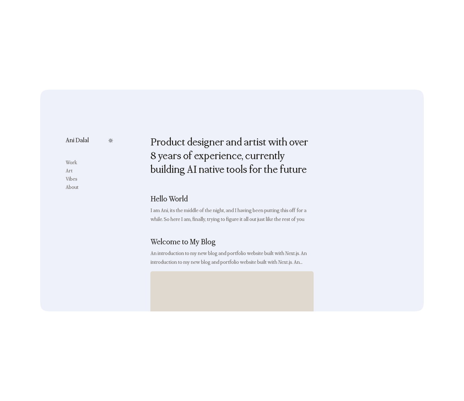 That meant a layout that could hold anything without needing to be redesigned when my work shifted. Fixed sidebar, three tags (Work, Art, Vibes) and a chronological feed. One-liner about who I am. Each item opens into a full post. That's it.