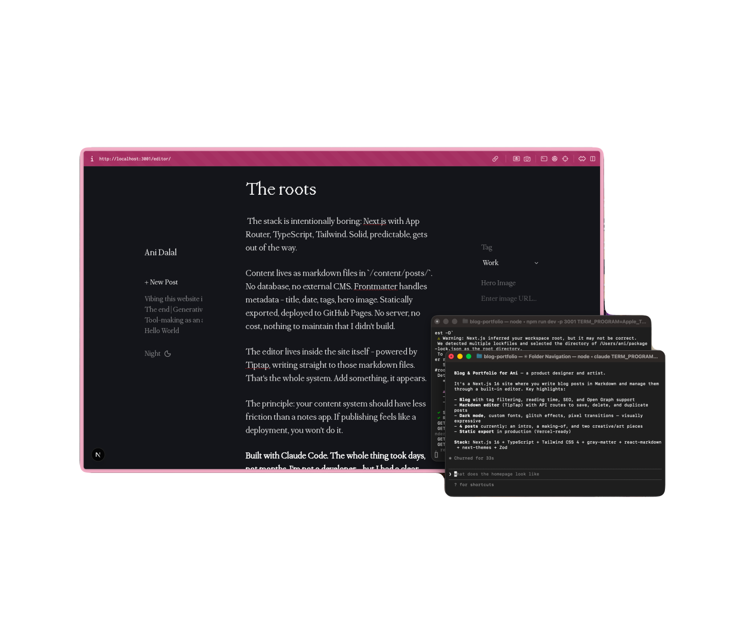 That meant building a custom editor with Tiptap, an open-source headless editor, that wrote back to the filesystem. And this is where Claude Code and I went back and forth the most. Not because it couldn't build it, but because what I wanted was specific in ways I had to discover through iteration.
